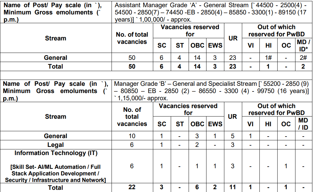 વર્ષ 2024 માટે, ગ્રેડ A અને ગ્રેડ B પોસ્ટ માટે 72 ખાલી જગ્યાઓ જાહેર કરવામાં આવી છે. આ વર્ષે, SIDBI, SIDBI ગ્રેડ A ભરતી દ્વારા સામાન્ય પ્રવાહમાં SIDBI ગ્રેડ A ઓફિસર પોસ્ટ્સ માટે 50 ખાલી જગ્યાઓ અને ગ્રેડ B પોસ્ટ્સ માટે 22 જગ્યાઓની જાહેરાત કરી છે, જેના માટે વર્ગ-વાર વિતરણ નીચે મુજબ છે.